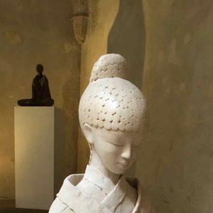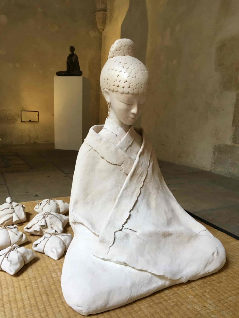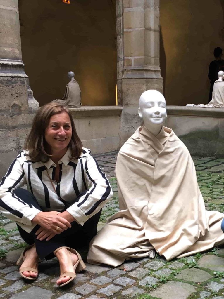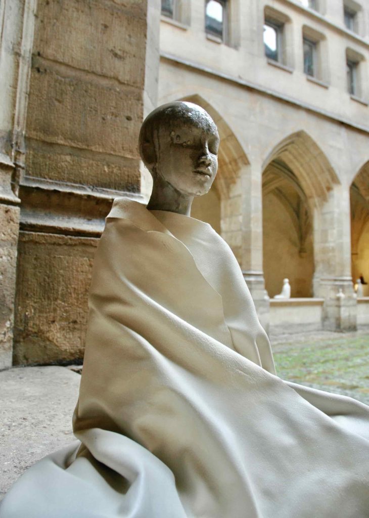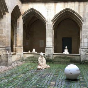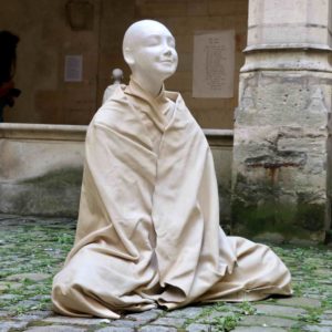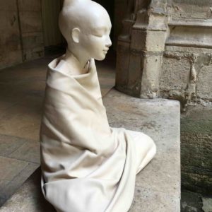 On avance à pas feutrés de peur de les réveiller. Ce sont eux qu’on voit d’abord. Au loin, allongés comme dans un dortoir en plein ciel. On s’approche intrigués. Ils sont là, disposés ensemble dans l’enceinte du cloître. Ils sont des centaines. Qui ? Les petits « dormeurs », enveloppés d’un linge mi- lange mi- linceul, bébés fragiles qui nous disent que tout ne tient qu’à un fil, celui de la vie qui s’affirme ou se défausse, selon. Au seuil de l’existence, qui sommes nous sinon les vivants les plus à la merci des autres qui soient ? Des vulnérables.